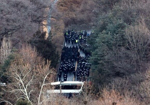 고위공직자범죄수사처(공수처)와 경찰이 윤석열 대통령에 대한 2차 체포영장 집행에 나선 지난 1월15일 용산구 한남동 대통령 관저에서 경찰 병력이 2차 저지선을 넘어 진입하고 있다.사진=연합뉴스