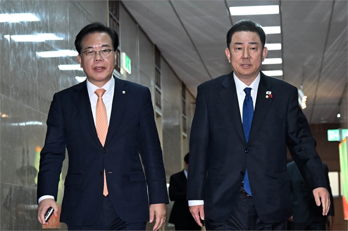 더불어민주당 김병기 원내대표(오른쪽)와 국민의힘 송언석 원내대표가 지난 9일 서울 여의도 국회에서 우원식 국회의장과 회동을 가진 뒤 의장실을 나서고 있다.사진=연합뉴스
