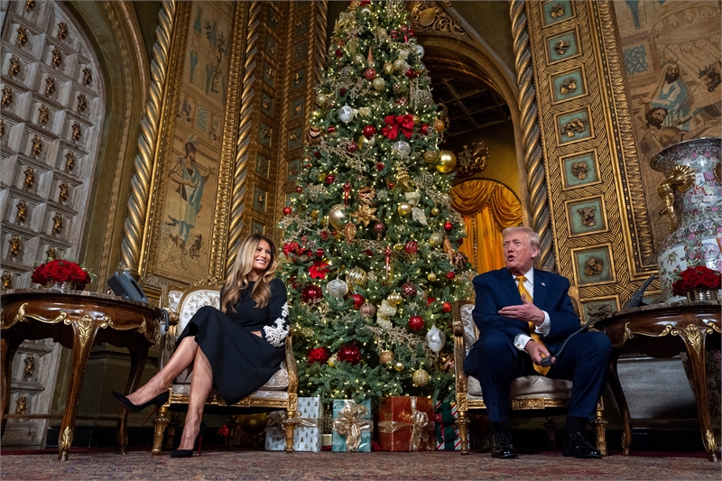 24일(현지시간) 미국 플로리다주 팜비치 소재 마러라고 클럽에서 도널드 트럼프(오른쪽) 미국 대통령과 그의 부인인 멜라니아 트럼프(오른쪽)가 북미항공우주사령부(NORAD)가 운영하는 'NORAD 산타 추적 핫라인'에 연결돼 어린이들과 통화하고 있다.사진=연합뉴스