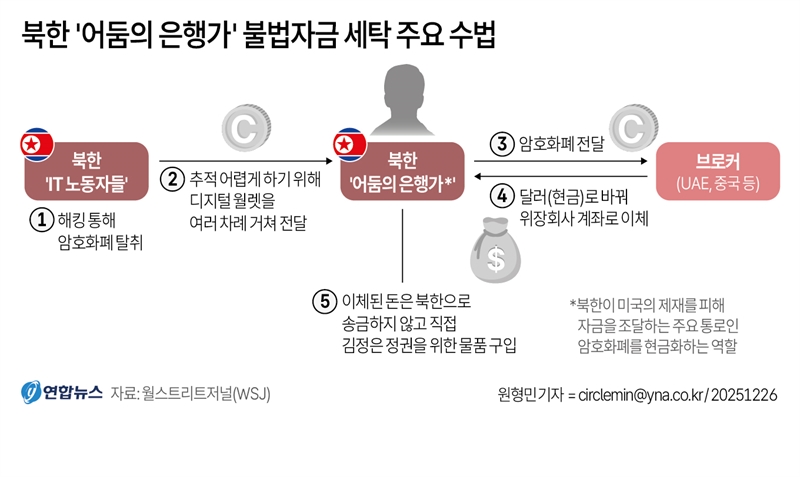 북한 김정은 정권이 미국의 제재를 피해 자금을 조달하는 주요 통로인 암호화폐 탈취에는 이를 현금화하는 '어둠의 은행가'들이 수십명 있다. 월스트리트저널(WSJ)이 미 법무부의 기소장 등을 토대로 25일(현지시간) 보도한 대표적 인물 심현섭(42)의 주요 임무는 해외에서 북한 김정은 일가를 위한 불법자금을 세탁하는 일이었다.사진=연합뉴스