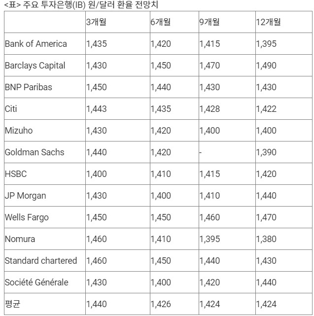 일부 은행들이 비교적 낮은 1천300원대 후반을 제시하기도 했으나, 향후 12개월 전망에서는 뱅크오브아메리카(BoA, Bank of America)가 1천395원, 골드만삭스는 1천390원, 노무라는 1천380원 수준을 예측했지만, 전반적으로 1천400원대 초중반이 우세했다.
