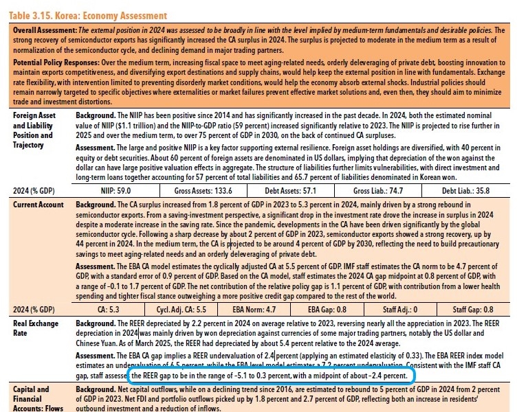 이는 국제통화기금(IMF, International Monetary Fund)이 2024년 기준으로 추정한 적정 원/달러 환율 1천330원 선과 상당한 격차를 보여, 구조적인 외환 수급 문제 해결이 시급하다는 해석이 제기된다.