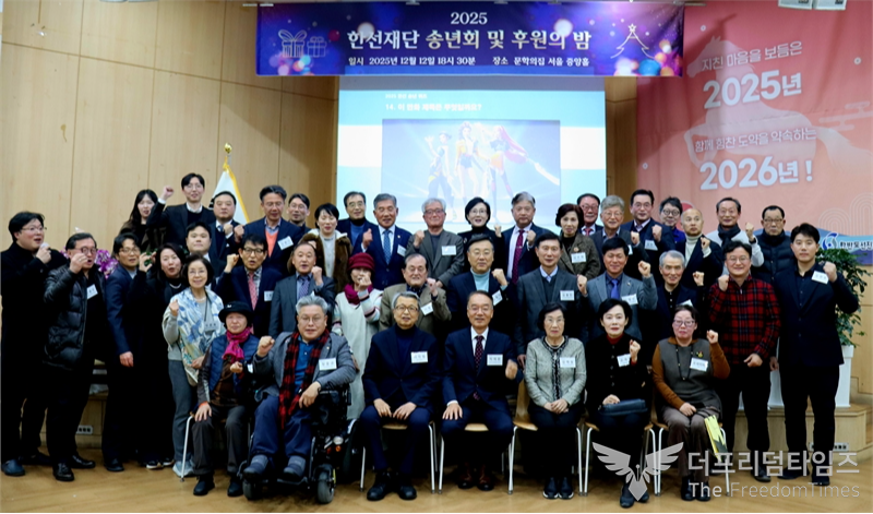 지난 12일 문학의집 서울 산림문학관 중앙홀에서 열린 ‘한반도선진화재단’ 2025 송년회 및 후원의 밤 「빛을 찾는 밤 with 한선」 행사를 마친 뒤 참석자들이 기념촬영을 진행했다.사진=더프리덤타임즈