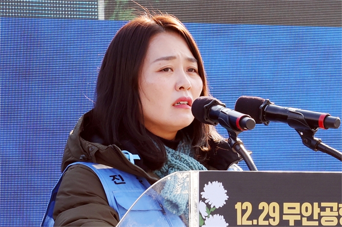 12·29 제주항공 여객기 참사 1주기를 이틀 앞둔 27일 오후 광주 동구 5·18 민주광장에서 열린 1주기 광주·전남 추모대회에서 김유진 유가족협의회 대표가 인사말하고 있다.사진=연합뉴스