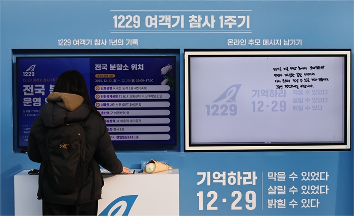 12·29 무안공항 제주항공 여객기 참사 1주기인 29일 서울역에 마련된 디지털 분향소에 추모의 메시지가 적혀있다.사진=연합뉴스