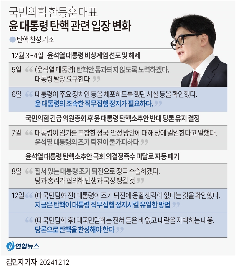 [그래픽] 국민의힘 한동훈 대표 윤석열 대통령 탄핵 관련 입장 변화