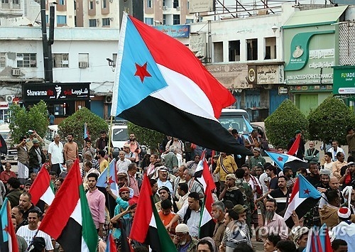 예멘 하덴항에서 남예멘 깃발과 UAE 국기 흔드는 주민들.사진=연합뉴스
