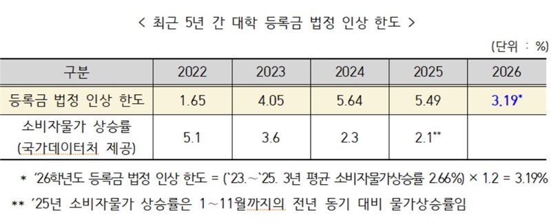 교육부는 2026학년도 대학과 대학원 등록금 법정 인상 한도가 3.19퍼센트(%)로 산정됐다고 31일 밝혔다.
