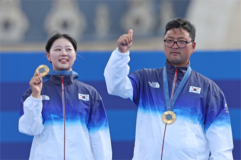 지난해 8월 2일(현지시간) 프랑스 파리 레쟁발리드에서 열린 2024 파리올림픽 양궁 혼성 단체 시상식에서 김우진과 임시현이 금메달을 목에 걸고 있다.사진=연합뉴스