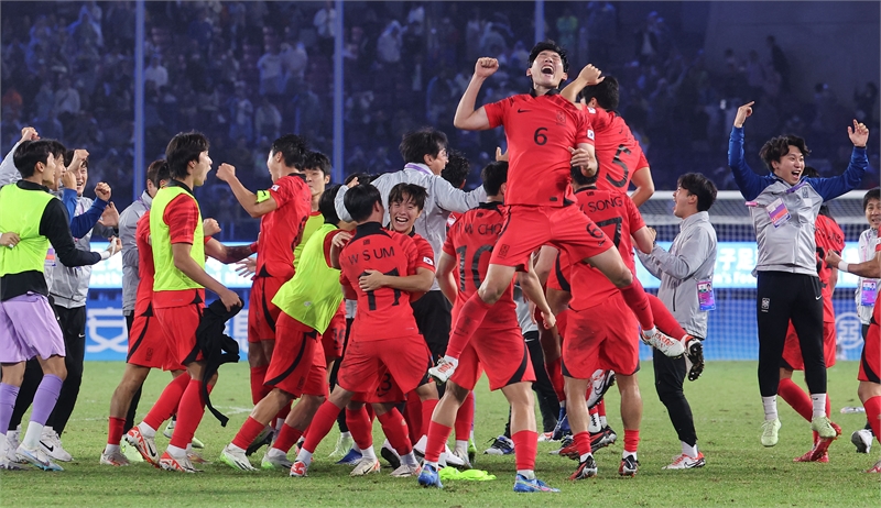 7일 중국 항저우 황룽 스포츠센터 스타디움에서 열린 2022 항저우 아시안게임 남자축구 대한민국과 일본의 결승전. 한국 선수들이 2대1 승리 후 기뻐하고 있다.사진=연합뉴스