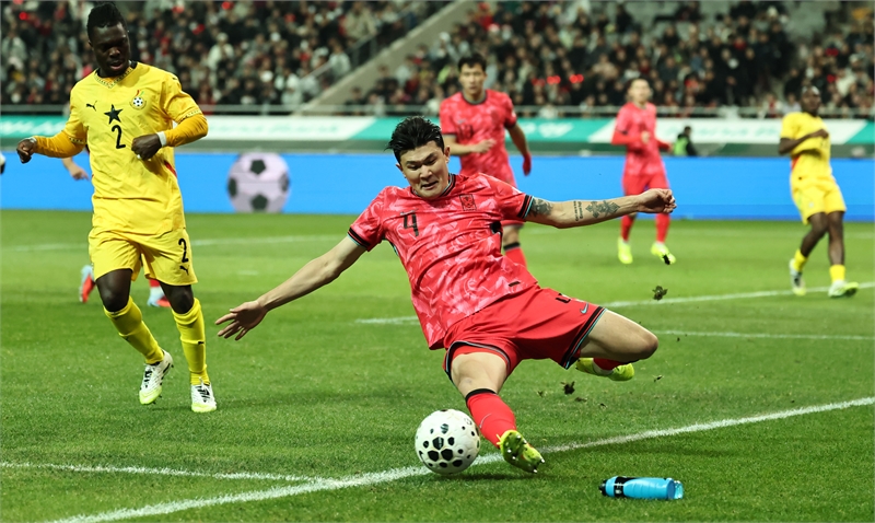 지난해 11월18일 서울 마포구 서울월드컵경기장에서 열린 남자축구 국가대표 A매치 평가전 대한민국과 가나의 경기. 김민재가 공을 걷어내기 위해 끝까지 따라가 발을 뻗고 있다.사진=연합뉴스