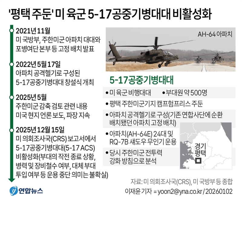 평택 주한미군 기지에 주둔해온 미 육군 5-17공중기병대대가 지난해 12월 15일자로 운용 중단된 사실이 1일(현지시간) 미 의회조사국(CRS, Congressional Research Service) 보고서를 통해 파악됐다.