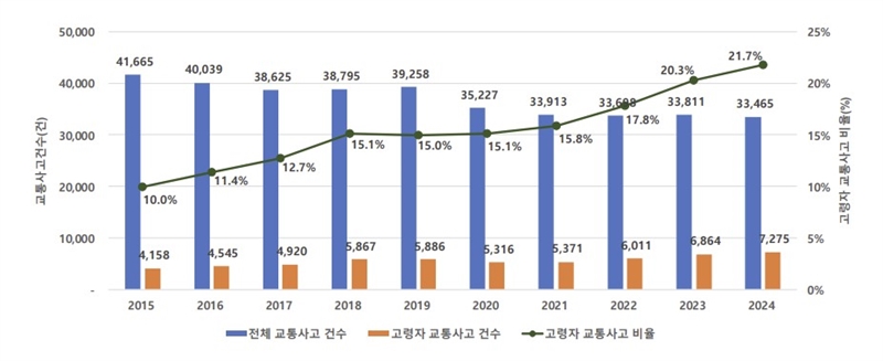 2015년 고령 운전자 유발 사고는 4천158건으로 전체 교통사고의 9.9퍼센트(%)를 차지했으나, 2024년에는 7천275건으로 전체의 21.7퍼센트(%)까지 치솟았다.