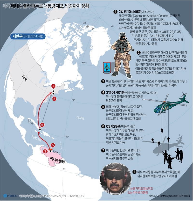 [그래픽] 미국 베네수엘라 마두로 대통령 체포·압송까지 상황