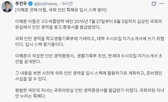 이와 더불어 국민의힘 주진우 의원은 이날 자신의 엑스(X, 구 트위터)를 통해 이혜훈 후보자의 셋째 아들 국회 인턴 특혜 의혹을 제기하며 논란을 가중시켰다.