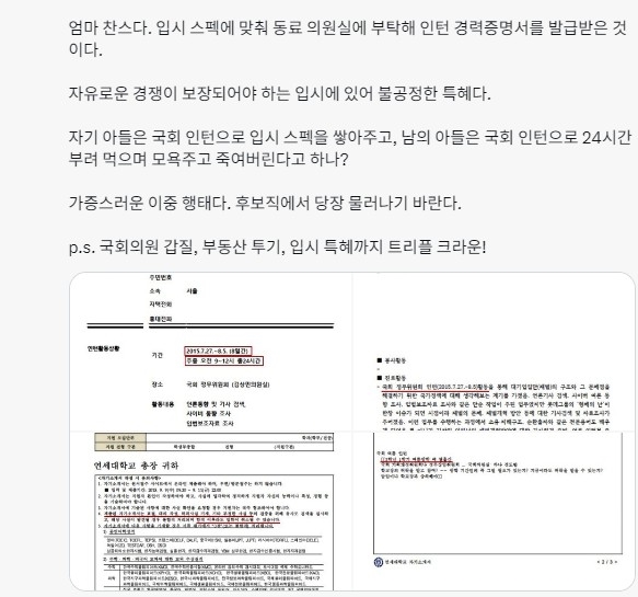 그는 이를 두고 "엄마 찬스다. 입시 스펙에 맞춰 동료 의원실에 부탁해 인턴 경력 증명서를 발급받은 것"이라고 비판했다.