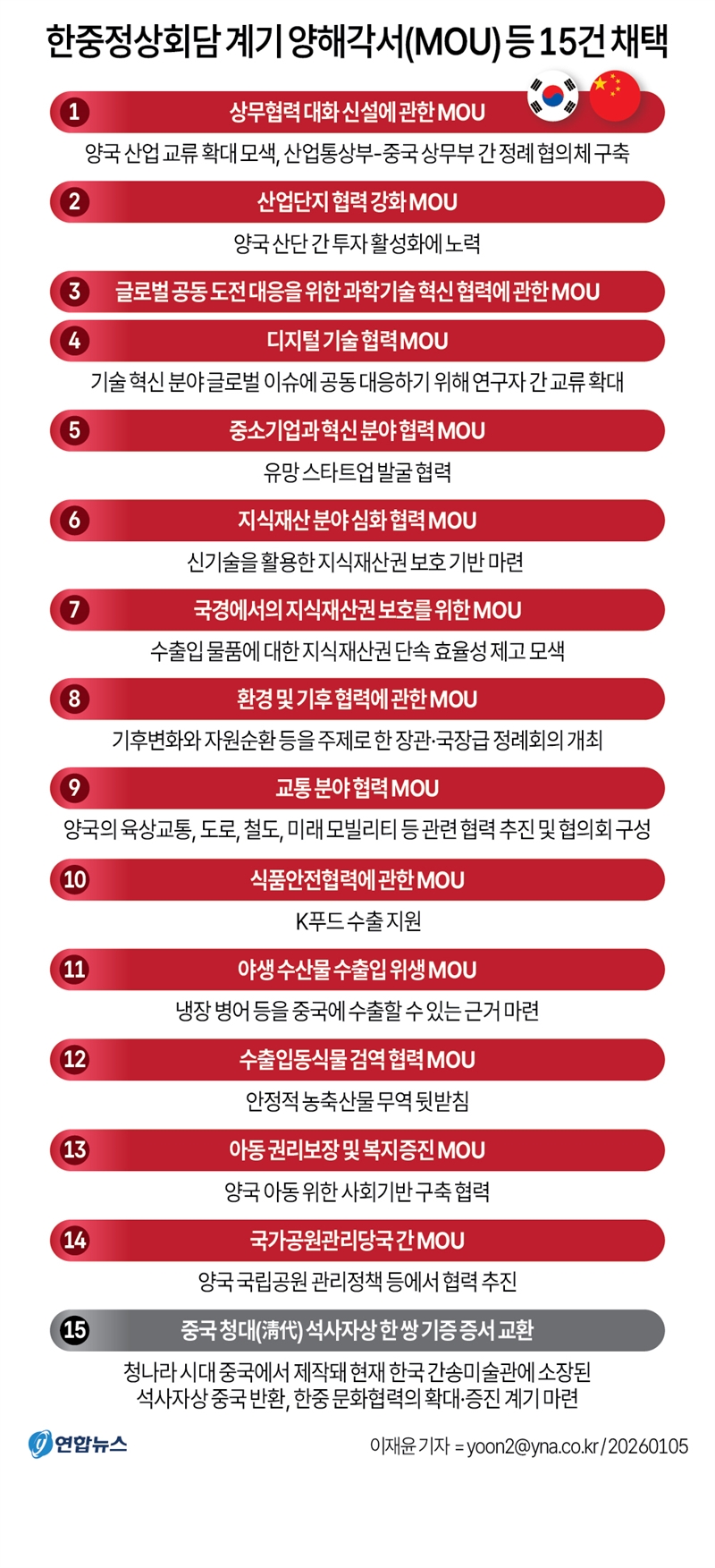 한국과 중국 정부가 5일(현지시간) 베이징에서 열린 이재명 대통령과 시진핑 국가주석의 정상회담을 계기로 산업·환경·지식재산권 등 다양한 분야의 협력 강화를 위한 문서를 다수 채택했다. 이날 채택된 문건은 양해각서(MOU) 14건과 한국에 있는 중국의 문화유산을 중국 측으로 기증하는 내용의 증서 등 모두 15건이다.사진=연합뉴스