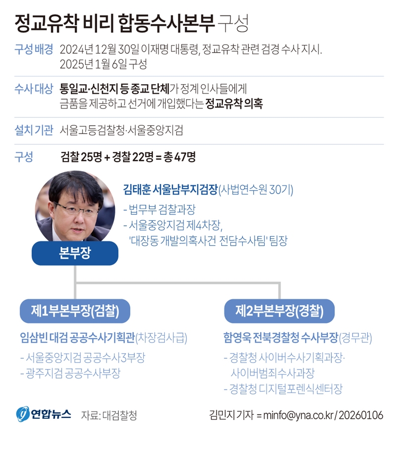 합수본은 이날 보도자료를 통해 “특정 종교단체가 교단 조직과 자금, 인적 네트워크를 활용해 정치권에 영향력을 행사했다는 의혹이 다수 제기된다”고 출범 배경을 설명했다.