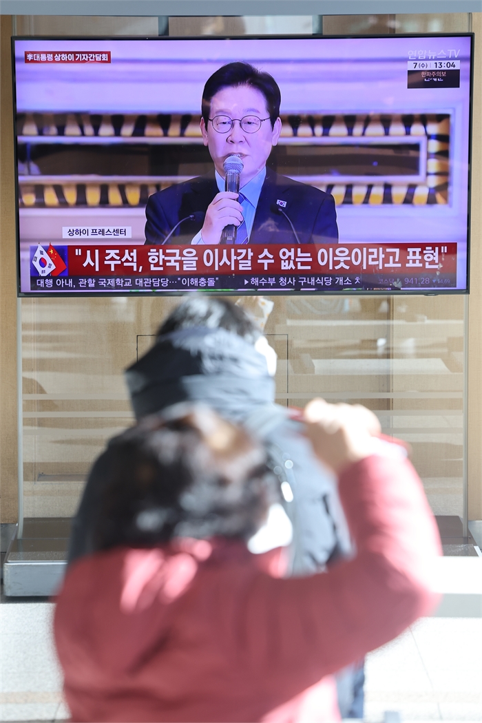 7일 서울역 대합실 화면에서 중국을 국빈 방문 중인 이재명 대통령의 상하이 현지 기자간담회 중계방송이 흘러나오고 있다.사진=연합뉴스