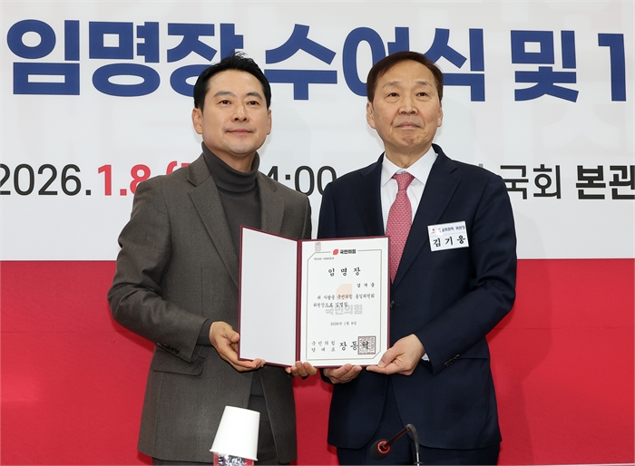 국민의힘 장동혁 대표가 8일 서울 여의도 국회에서 열린 국민의힘 통일위원회 임명장 수여식 및 제1차 전체 회의에서 김기웅 위원장에게 임명장을 수여하고 있다.사진=연합뉴스
