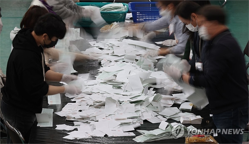제22대 국회의원선거가 실시된 지난 2024년 4월10일 오후 대구 남구 영남이공대학교 천마체육관 개표소에서 개표사무원이 수개표를 하고 있다.사진=연합뉴스