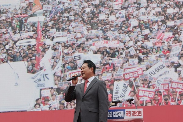 국민의힘 장동혁 대표가 지난해 9월28일 서울 시청역 인근 세종대로에서 열린 사법파괴 입법독재 국민 규탄대회에서 발언하고 있다.사진연합뉴스