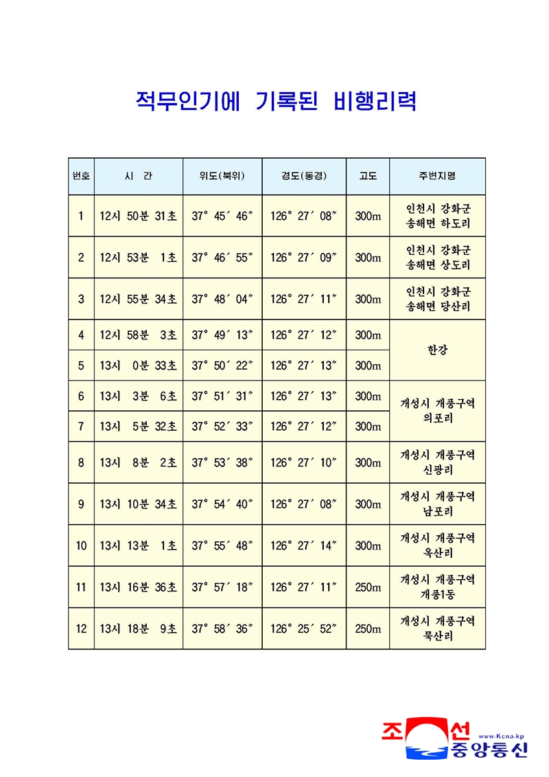 북한은 무인기에 기록된 비행 경로도 함께 공개했으며, 비행 이력에는 시간, 위도, 경도, 고도, 주변 지명이 상세히 기록돼 있었다고 밝혔다.