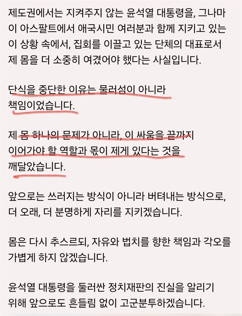 자유민주주의를 사랑하는 주권 국민이여, 이제 모두 일어서야 할 때다. 이 무도하고 사악한 가짜 정권을 역사의 심판대 위에 세우고, 부정선거 의혹을 비롯한 모든 불의를 파헤쳐 정의를 바로 세워야 한다. 우리는 박준영 대표를 비롯해 시대의 어둠에 맞서는 청년들에게 물심양면의 전폭적 지지를 보내야 마땅하며, 그의 고귀한 생명을 지키기 위해 박 대표는 단식을 즉시 중단하길 간곡히 요청한다. 지금이라도 보수우파 정치세력들은 통렬히 반성하고 자유대학의 단식 투쟁에 동참하여 민족의 죄인이 아닌 민족의 지도자로 거듭나야 할 것이다. 하늘은 반드시 부정선거 음모론을 외치는 사악한 진짜 내란세력과 동조자들에게 정의의 철퇴를 내릴 것이며, 역사는 결코 침묵하지 않을 것이다. '더프리덤타임즈'는 자유대학이 이끄는 청년들과 자유 주권 국민의 항거를 끝까지, 전면적으로 지지하며, 오직 진실만이 승리하는 그날까지 함께할 것임을 천명한다.