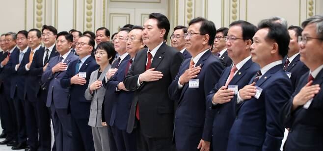 윤석열 대통령이 지난 8월 29일 청와대 영빈관에서 열린 제21기 민주평화통일자문회의 간부위원과의 통일대화에서 국기에 경례하고 있다. (사진=연합뉴스 제공)