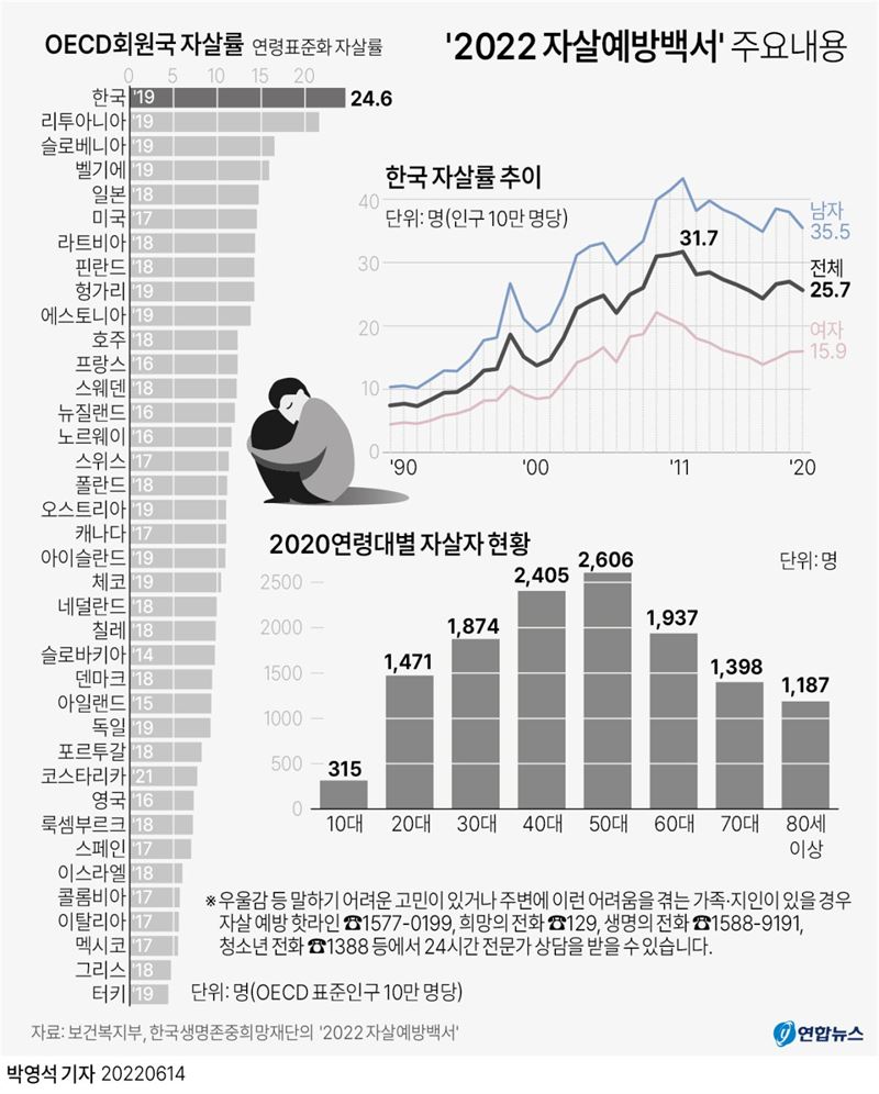 지난 2022년 6월14일 보건복지부와 한국생명존중희망재단의 '2022 자살예방백서'에 따르면, 2020년 자살자 수는 1만3천195명으로 전년보다 604명(4.4%) 감소한 것으로 나타났다. (사진=연합뉴스 제공)