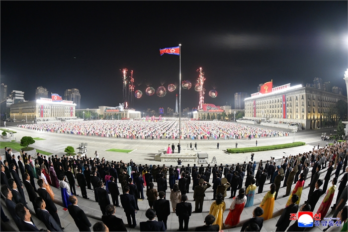 북한은 공화국 창건 77주년(9ㆍ9절)을 맞아 지난 8일 저녁 평양 김일성광장에서 국기게양식을 진행했다고 조선중앙통신이 9일 보도했다.사진=연합뉴스