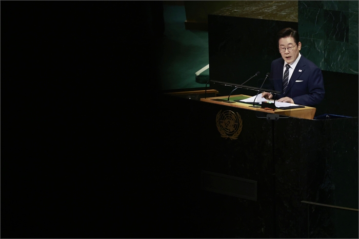 이재명 대통령이 23일(현지시간) 미국 뉴욕 유엔본부 총회장에서 기조연설을 하고 있다.사진=연합뉴스