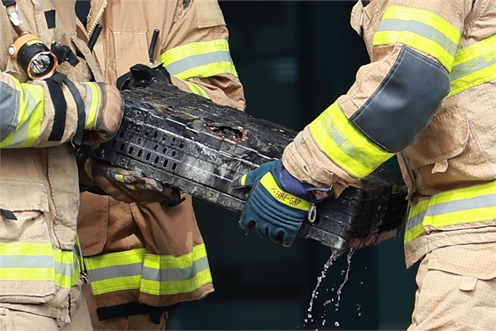 지난 27일 대전 유성구 국가정보자원관리원(국정자원)에서 소방대원이 불에 탄 배터리를 옮기고 있다. 전날 정부 전산시스템이 있는 국정자원에서 무정전·전원 장치(UPS)용 리튬이온배터리 화재가 발생해 정부 전산 서비스가 대규모로 마비됐다.사진=연합뉴스