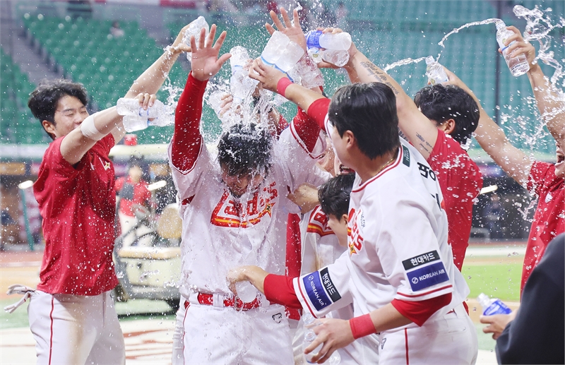 SSG 최정이 13일 인천 SSG랜더스필드에서 열린 프로야구 2025 신한 SOL 뱅크 KBO리그 NC 다이노스와 SSG 랜더스의 경기에서 6-3으로 승리한 후 동료들로부터 KBO 리그 최초 통산 500홈런 달성 축하를 물세례를 받고 있다.사진=연합뉴스