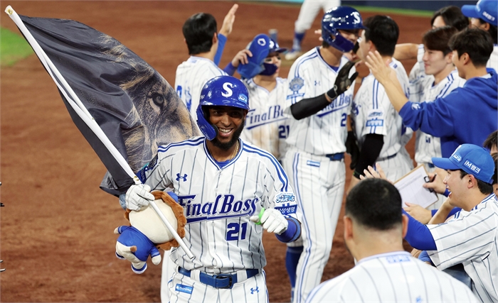 지난달 30일 대구 삼성라이온즈파크에서 열린 KIA와 삼성의 경기. 1회 말 1사 주자 1, 3루 상황에서 타석에 들어선 삼성 디아즈가 외국인 타자 단일시즌 첫 50번째 홈런이자 3점 홈런을 친 후 동료들의 축하를 받고 있다.사진=연합뉴스