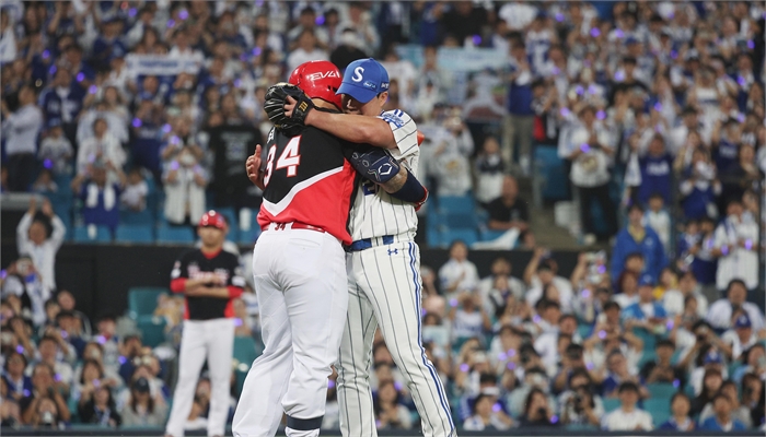 지난달 30일 대구 삼성라이온즈파크에서 열린 KIA와 삼성의 경기. 9회 초 이날 은퇴식을 하는 삼성의 마무리투수 오승환이 마운드에서 역투를 끝내고 타석에 있던 KIA 최형우와 인사하고 있다.사진=연합뉴스
