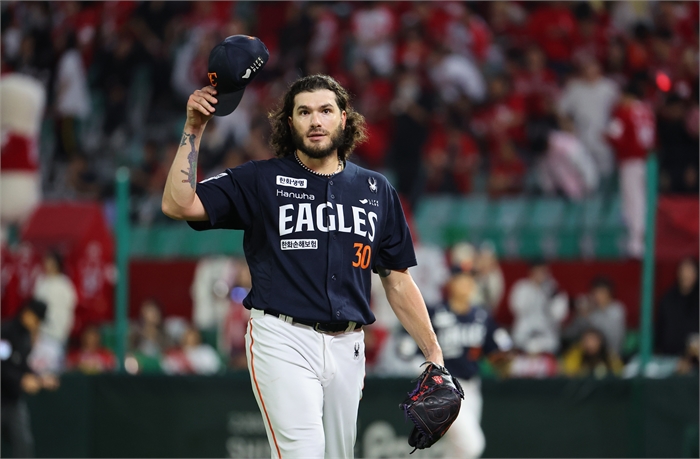 지난 1일 인천 SSG랜더스필드에서 열린 2025 프로야구 한화 이글스와 SSG 랜더스의 경기. 한화 폰세가 5회 말 투구를 마친 뒤 더그아웃으로 향하며 기뻐하고 있다.사진=연합뉴스