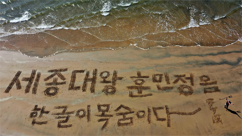 서예가 쌍산 김동욱씨가 한글날을 앞두고 지난 2022년 10월7일 경북 포항시 북구 영일대해수욕장에서 모래에 갈고리로 "세종대왕 훈민정음 한글이 목숨이다"란 문구를 쓰는 행위예술을 하고 있다.사진=연합뉴스