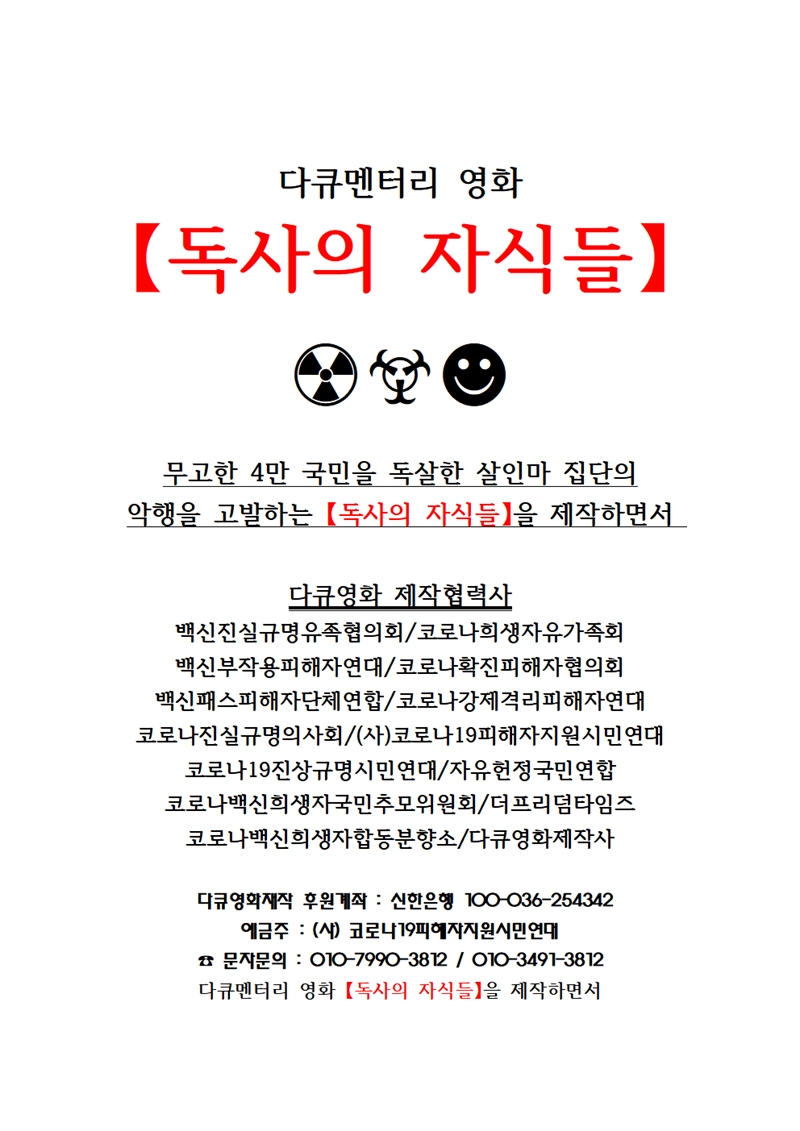중국에 굴종하며 국민을 박해하는 범죄 집단에 의해 멸망하는 나라를 구하겠다고 나선 국민들이 법치와 자유, 공정과 상식을 회복시키고 세상을 바꿀 다큐멘터리 「독사의 자식들」 제작을 뜨겁게 응원하고 있다. 내년 2월까지 이 다큐영화 제작을 마치고 3월에 개봉하여 기적의 대한민국을 목숨 걸고 지키려는 국민들과 해외 동포들이 끔찍하고 참혹한 참상의 다큐영화 「독사의 자식들」을 관람하여 사악한 국민 독살범 민주당 집단을 엄중히 심판하는 구국의 다큐영화가 만들어지도록 후원과 기도를 간곡히 요청한다. "언론, 문화, 정치 권력을 쥐고 독재의 칼춤을 추고 있는 테러 집단에 맞서 유가족들이 살인 집단의 악행을 고발하는 다큐영화 『독사의 자식들』을 제작하여 방영할 것이다."