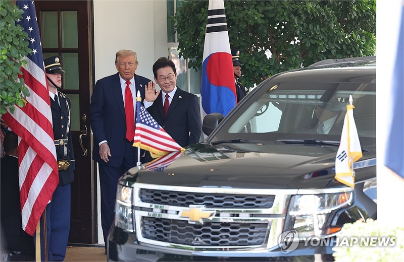 이재명 대통령이 지난 8월25일(현지시간) 미국 워싱턴 DC 백악관에서 영접나온 도널드 트럼프 미국 대통령을 만나 인사하고 있다.사진=연합뉴스