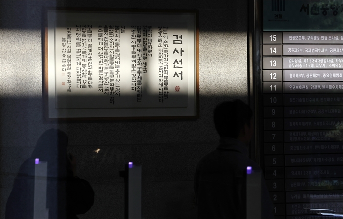 '대장동 항소 포기' 사태를 둘러싸고 검찰 내부에서 노만석 검찰총장 직무대행의 책임론이 확산하고 있는 11일 서울 서초구 서울중앙지방검찰청에 검사 선서가 걸려 있다. 노 대행은 이날 하루 연가를 내고 고심에 들어갔다.사진=연합뉴스