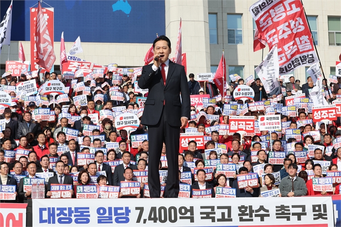국민의힘 장동혁 대표가 12일 서울 여의도 국회 본청 앞에서 열린 "대장동 일당 7400억 국고 환수 촉구 및 검찰 항소 포기 외압 규탄대회"에서 발언하고 있다.사진=연합뉴스