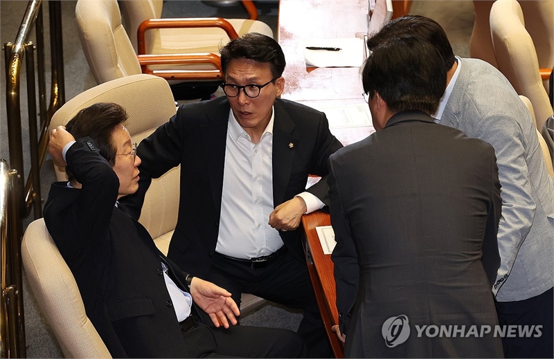 지난 2024년 10월4일 오후 더불어민주당 이재명 대표(왼쪽)와 김민석 의원 등이 열린 국회 본회의에서 윤석열 대통령의 재의 요구로 국회로 돌아온 '김건희 여사 특검법'과 '채상병 특검법', 지역화폐법(지역사랑상품권이용활성화법) 개정안 등 3개 법안과 관련한 투표를 앞두고 대화하고 있다.사진=연합뉴스