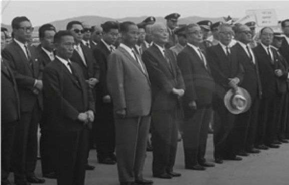 박정희 대통령(왼쪽앞)이 검은 정장에 두손을 잡고 이승만의 유해를 영접하기 위해 1965년 7월23일 김포공항에서 3부요인들과 함께 비행기를 기다리고 있다.(글.사진=뉴데일리 캡처)