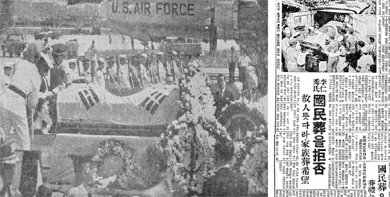 김포공항에서 거행된 이승만 유해 봉영식. 오른쪽 사진은 양자 이인수가 정부의 국민장 결정을 거부하고 가족장을 희망한다는 기사.사진=동아DB-조선DB/뉴데일리 캡처