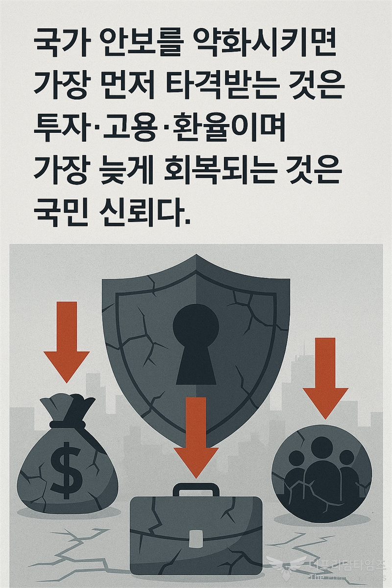 국가 안보를 약화시키면 가장 먼저 타격받는 것은 투자·고용·환율이며 가장 늦게 회복되는 것은 국민 신뢰다.