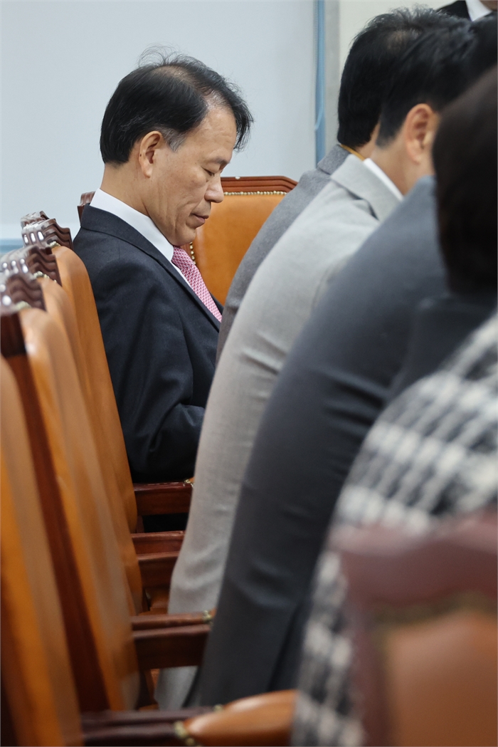 원조 친윤(친윤석열)으로 불렸던 국민의힘 3선 중진인 윤한홍 의원이 5일 서울 여의도 국회에서 열린 '혼용무도(昏庸無道) 이재명 정권 6개월 국정평가 회의'에서 굳은 표정으로 참석자들의 발언을 듣고 있다. 이날 윤 의원은 "윤석열 전 대통령과의 인연, 골수 지지층의 손가락질을 다 벗어던지고 계엄의 굴레를 벗어나자"고 말했다. 또 "우리 당 지지율은 과락 수준에서 변동이 없다. 왜 그렇겠느냐"며 "똥 묻은 개가 겨 묻은 개 비판하는 꼴이니 우리가 아무리 이재명 정부를 비판해도 국민 마음에 다가가지 못한다. 백약이 무효"라고 지적했다.사진=연합뉴스