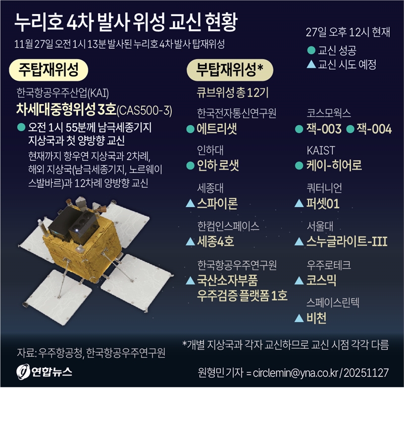 누리호 4차 발사가 주탑재위성인 차세대중형위성 3호는 물론 부탑재위성인 큐브위성 12기까지 모두 지상국과 교신에 성공하며 완전한 성공으로 최종 확정됐다.