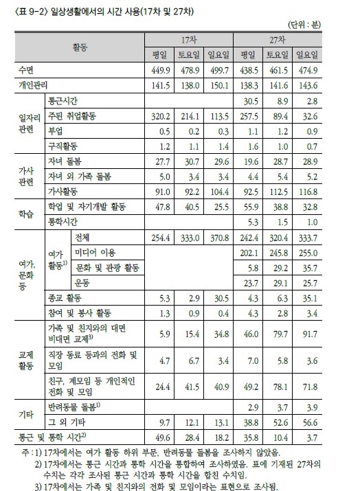 연구진이 2014년에 진행된 17차 조사 결과와 이번 27차 조사 결과를 비교하여 지난 10년간 개인의 일상생활에서 시간 사용 변화를 살펴본 결과, 노동 시간 감소와 여가 및 교제 활동 확대가 두드러지는 것으로 나타났다.